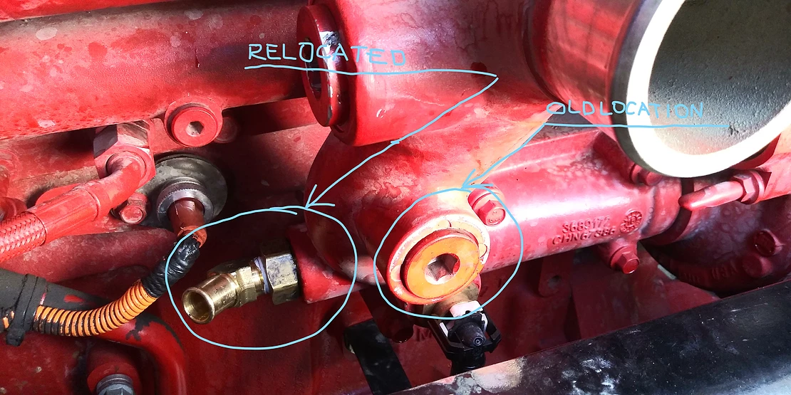 Mr. Smith agreed with me about very poor location of coolant fitting and suggested that if the truck was at Freightliner dealership facility, he could have addressed the issue with Freightliner Engineers, but in my case been an independent mobile truck repair company, there is “no access” to a process of submitting the report to them. Also, after carefully reviewing the pictures I have taken and listening patiently to my suggested solutions to this issue Lance suggested that probably this heater core hose was wrongly routed to fit this particular frame due to a different X15 engine applications and proposed to relocate a broken fitting in a different threaded opening in a coolant manifold and instead of that open bore put the plug that was taken out off that other opening.